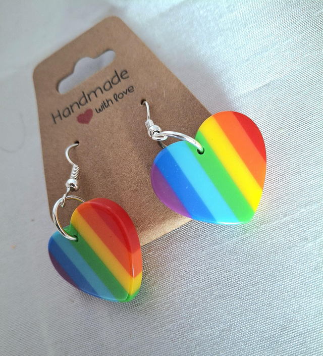 Made with Pride in mind these colourful hearts symbol love, friendship and equality. Made from polymer clay and hardened with resin for maximum durability these hearts are then individually constructed on a stainless steel hypoallergenic french hook.